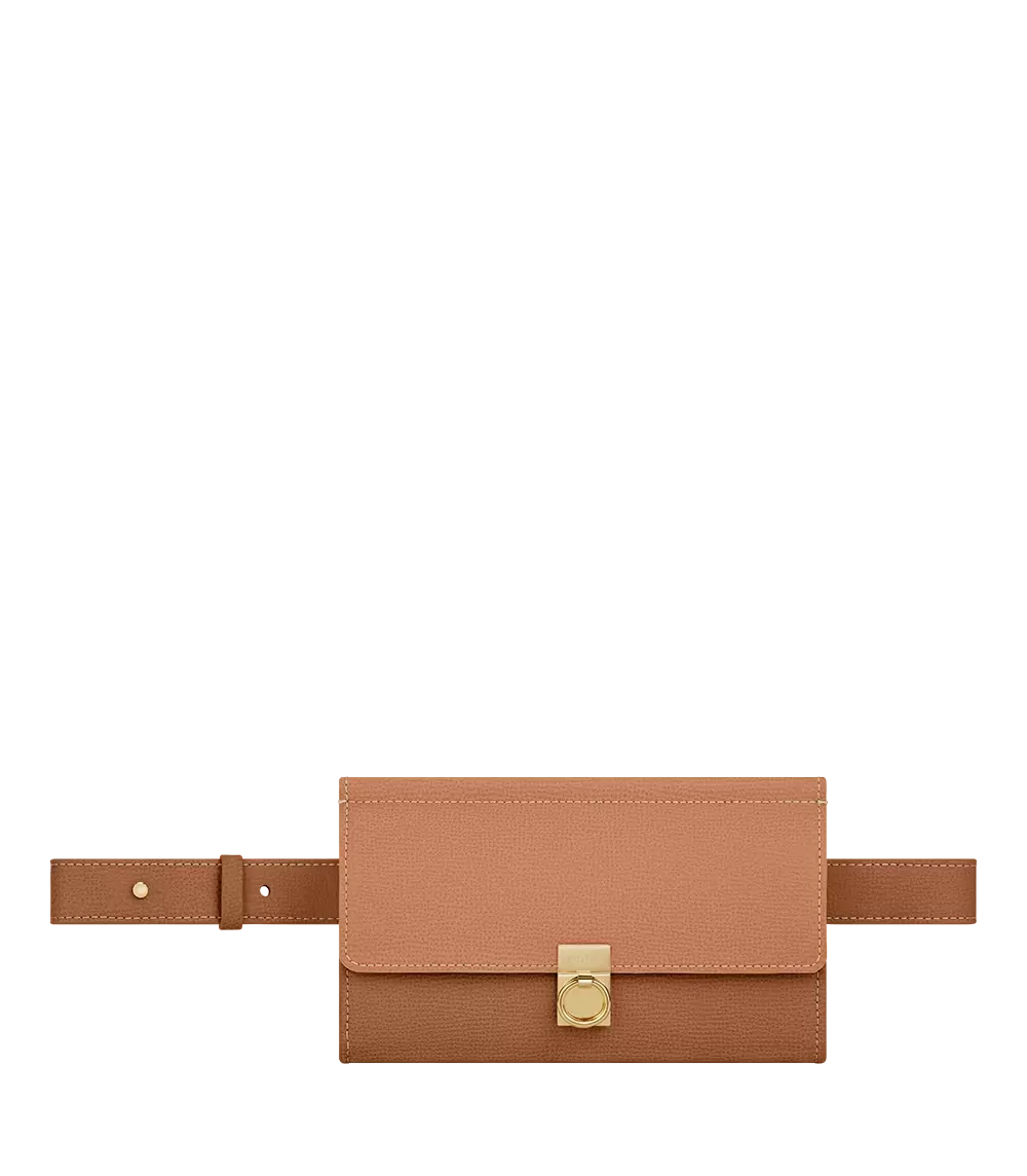 A wallet version of the “Numéro Sept” model with its signature central clasp. A belt allows it to be worn crossbody or around the waist.