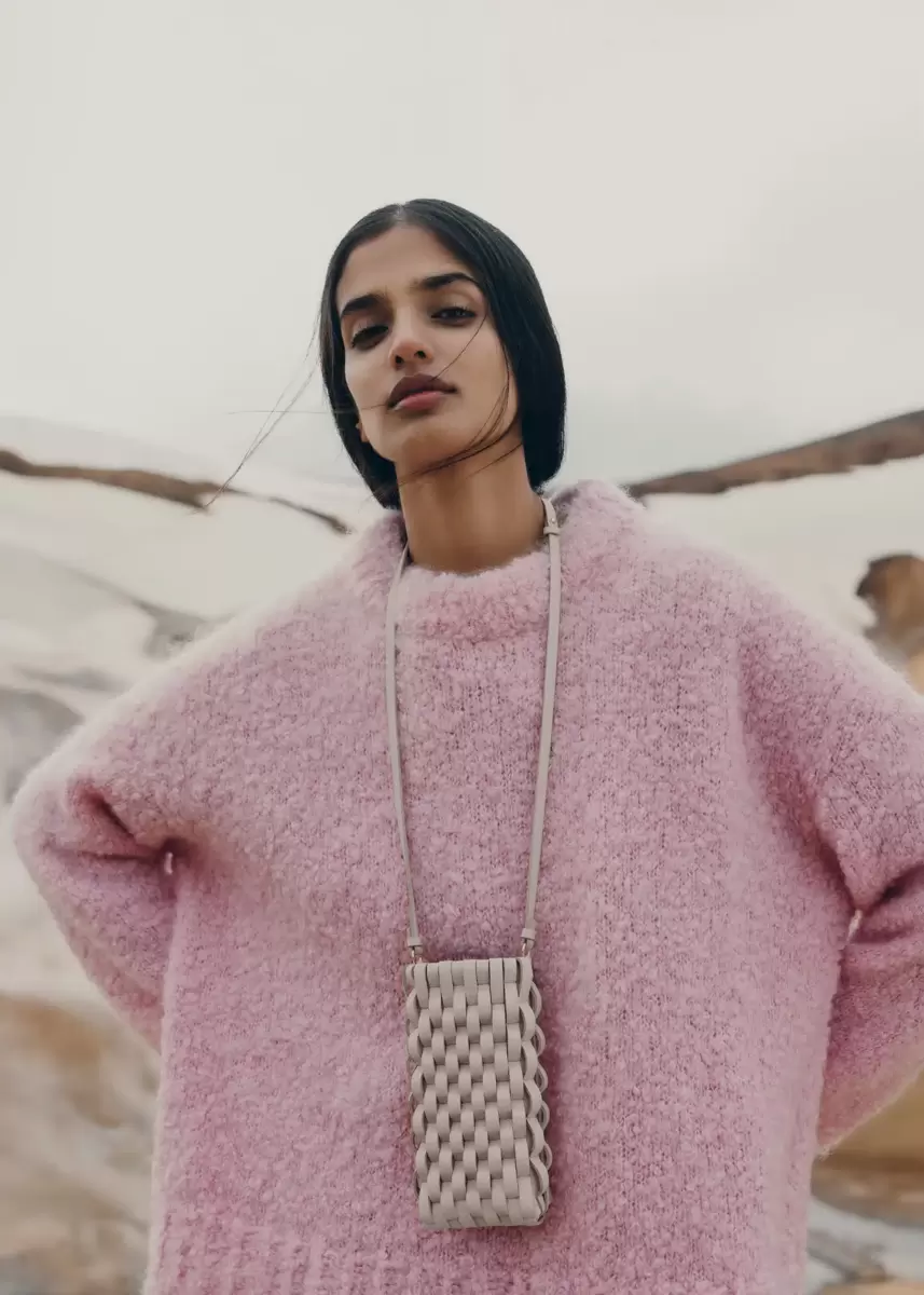 The Onda phone case is shaped by woven strips to form an undulating leather relief texture on the exterior. nWorn crossbody or around the neck, this accessory can also be used as a card holder.