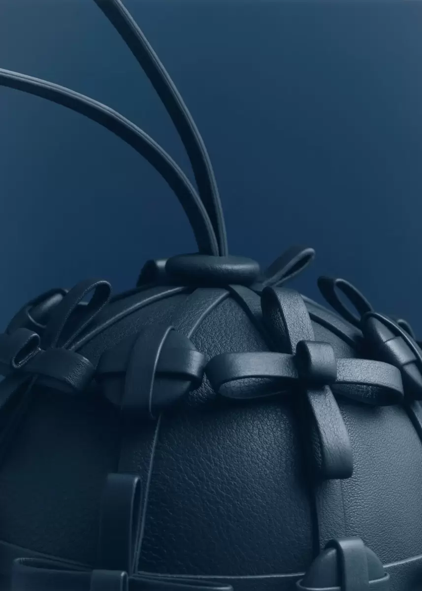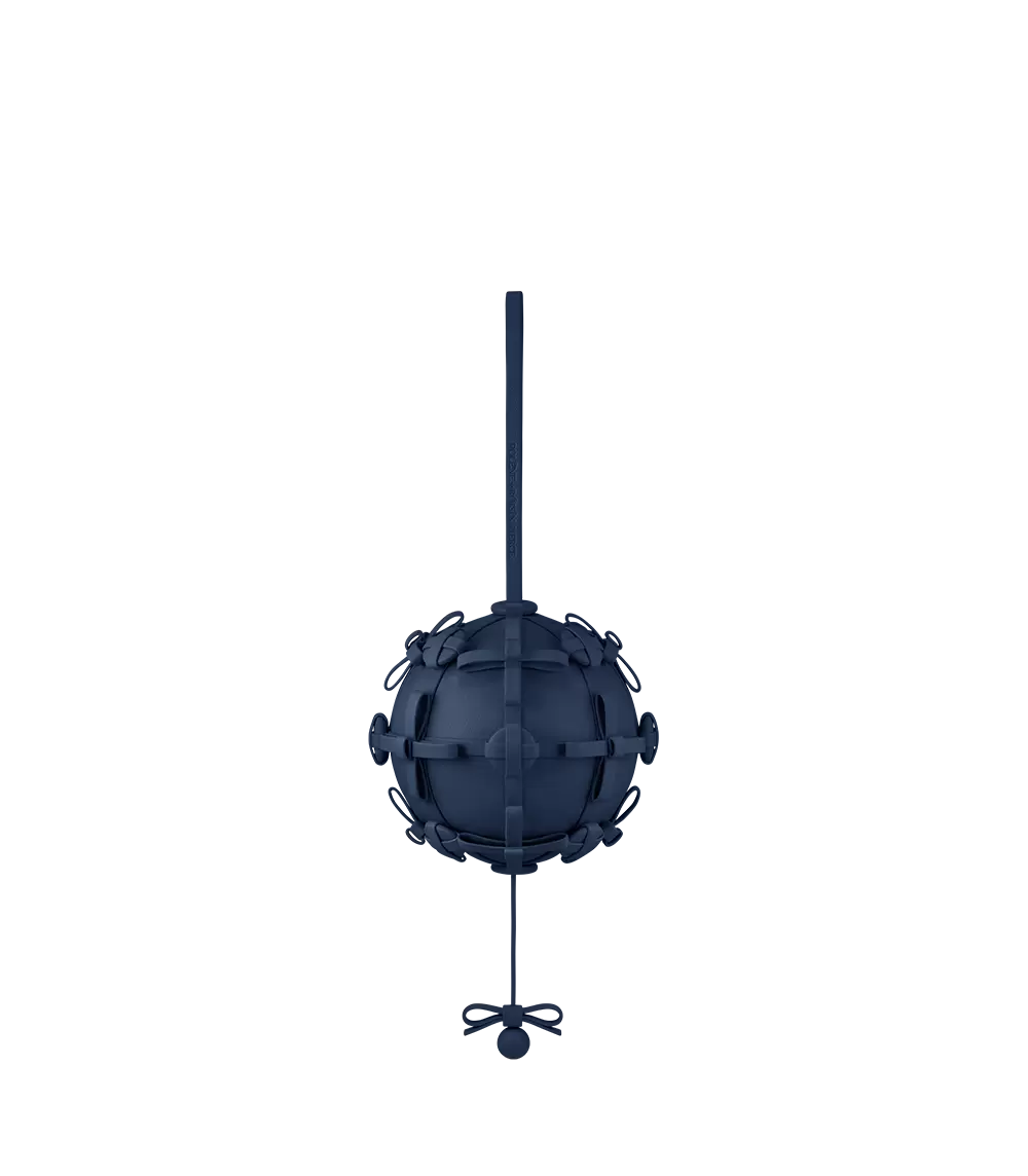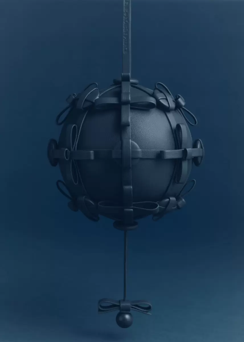 Poised on a handle, each hemisphere is wrapped in nappa leather and adorned with twenty-four meticulously hand-stitched and riveted buttons and bows. Beneath the sphere, a leather cord cradles a bow and an elegantly suspended round droplet.
