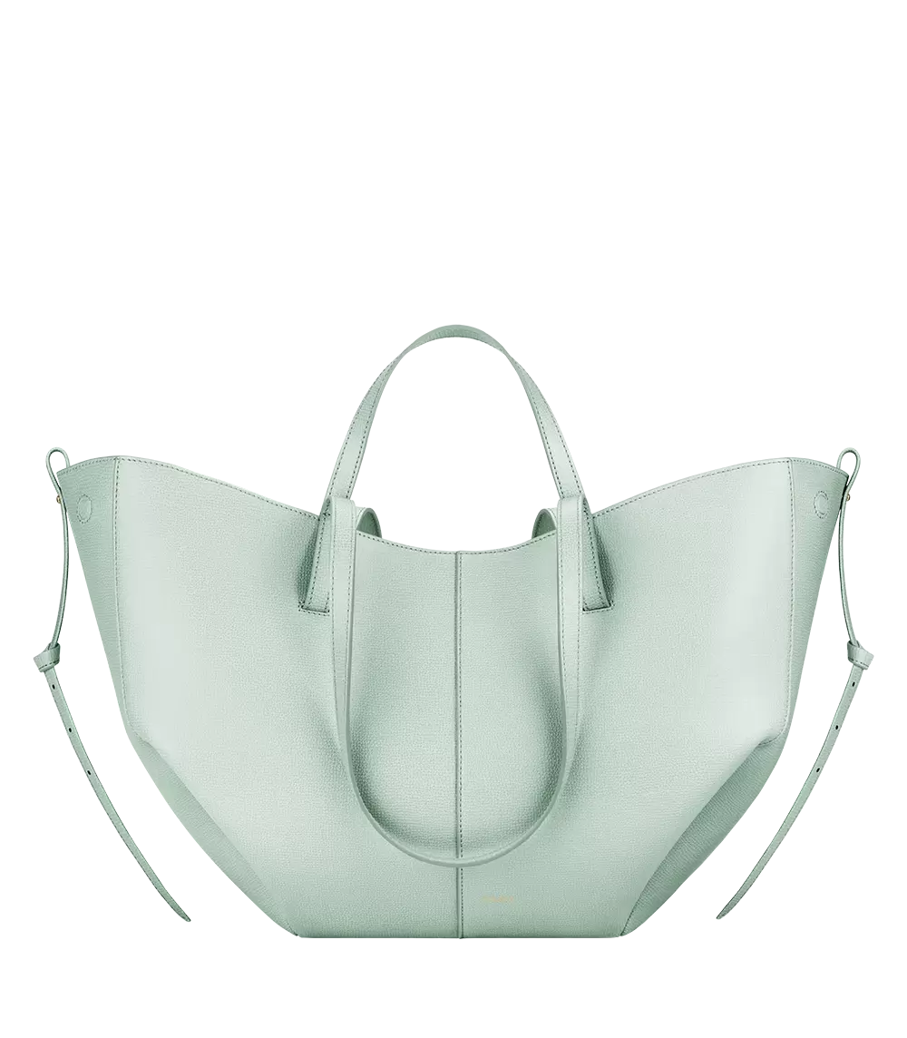 This sculptured tote bag featuring waves, folds, and curves can be used in two ways. Basket-style, with its sides open and straps on the outside, or As a flower-like closed bag, with its sides tucked in and its straps crossed on the inside.