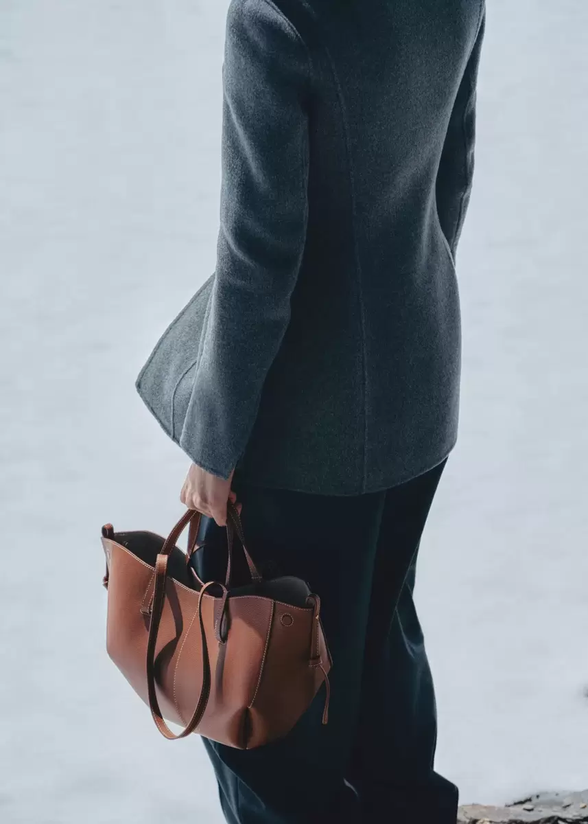 This sculptured compact tote bag featuring waves, folds, and curves can be used in two ways. Basket-style, with its sides open and straps on the outside, or As a flower-like closed bag, with its sides tucked in and its straps crossed on the inside.
