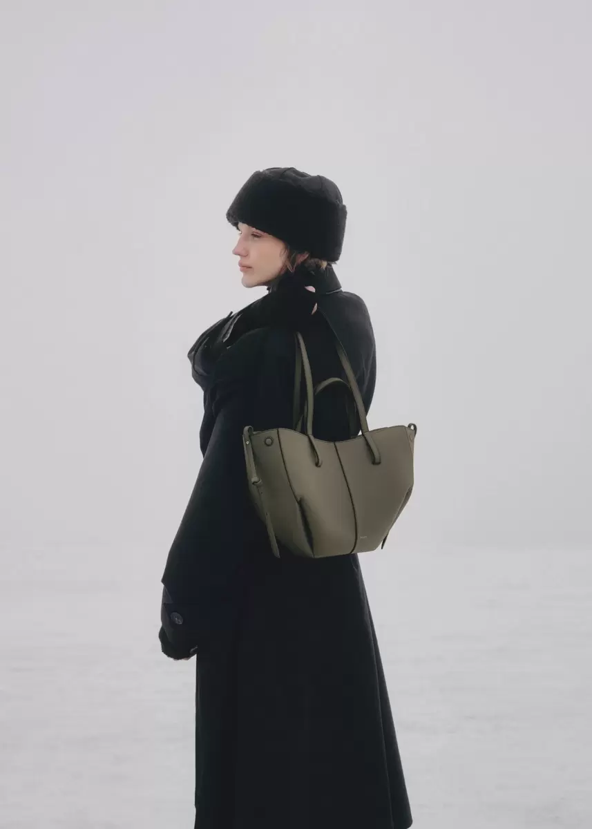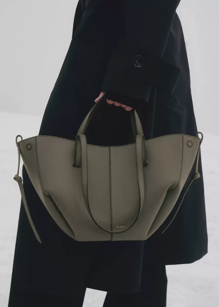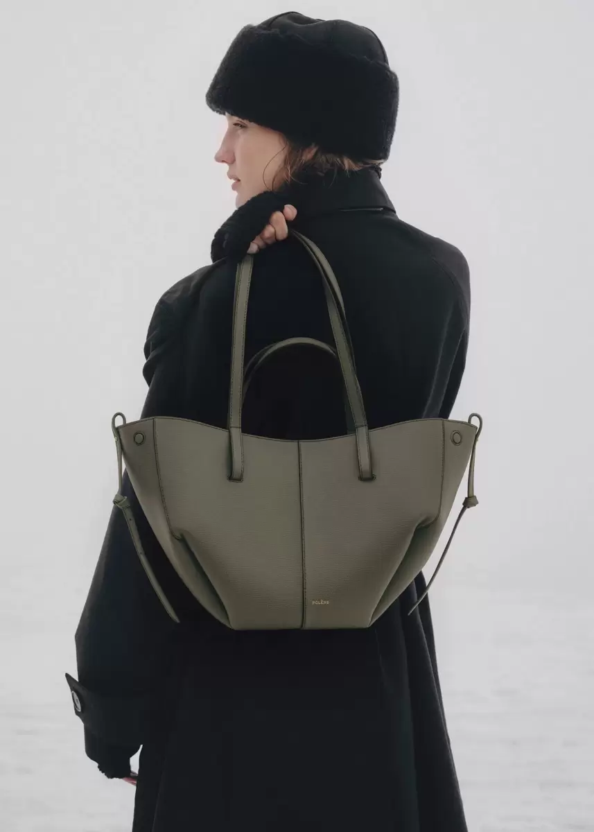This sculptured compact tote bag featuring waves, folds, and curves can be used in two ways. Basket-style, with its sides open and straps on the outside, or As a flower-like closed bag, with its sides tucked in and its straps crossed on the inside.