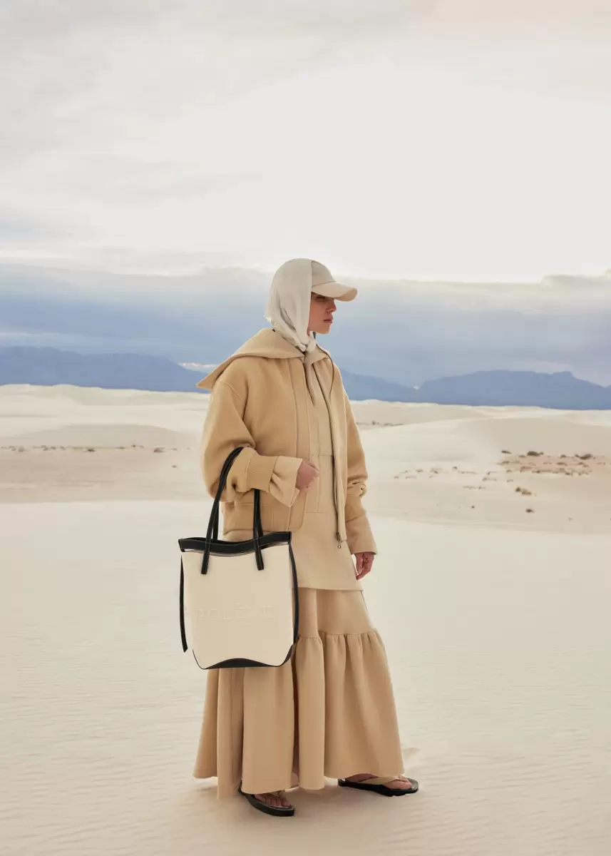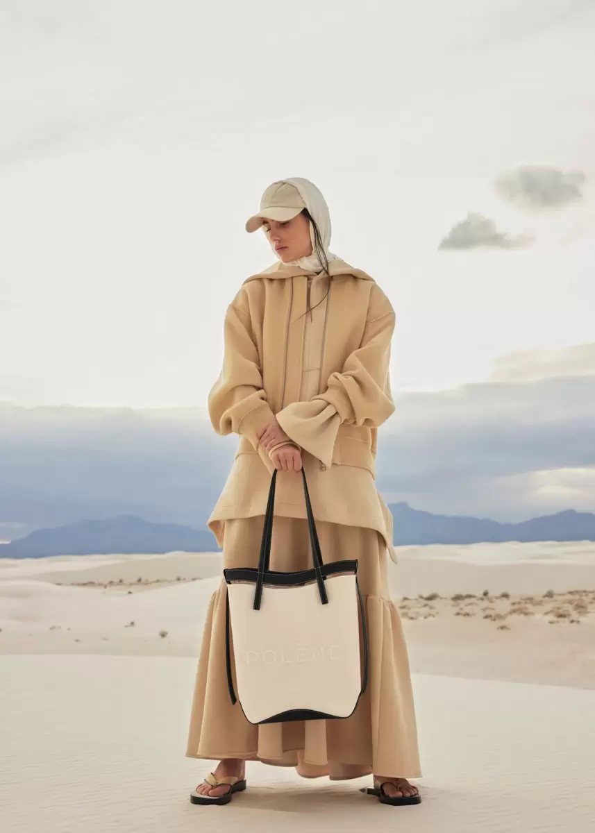 The “Ilo” tote bag combines functionality with leather detailing. Its cotton fabric is held in place by a series of loops and creates soft lines highlighted by thin strips of leather. Its vertical shape means that it can conveniently hold a laptop and A4 papers. Polène’s logo is elegantly imprinted with tone-on-tone high-frequency debossing.
