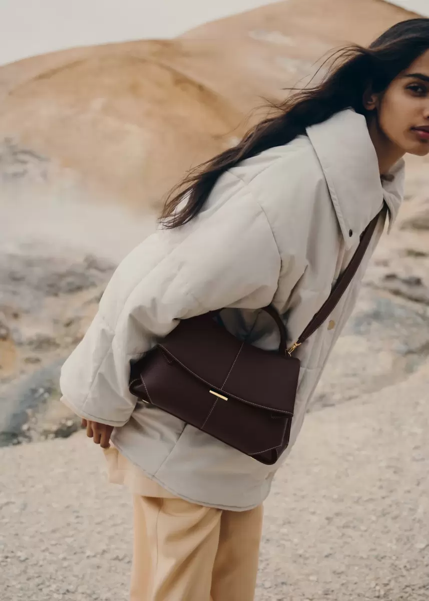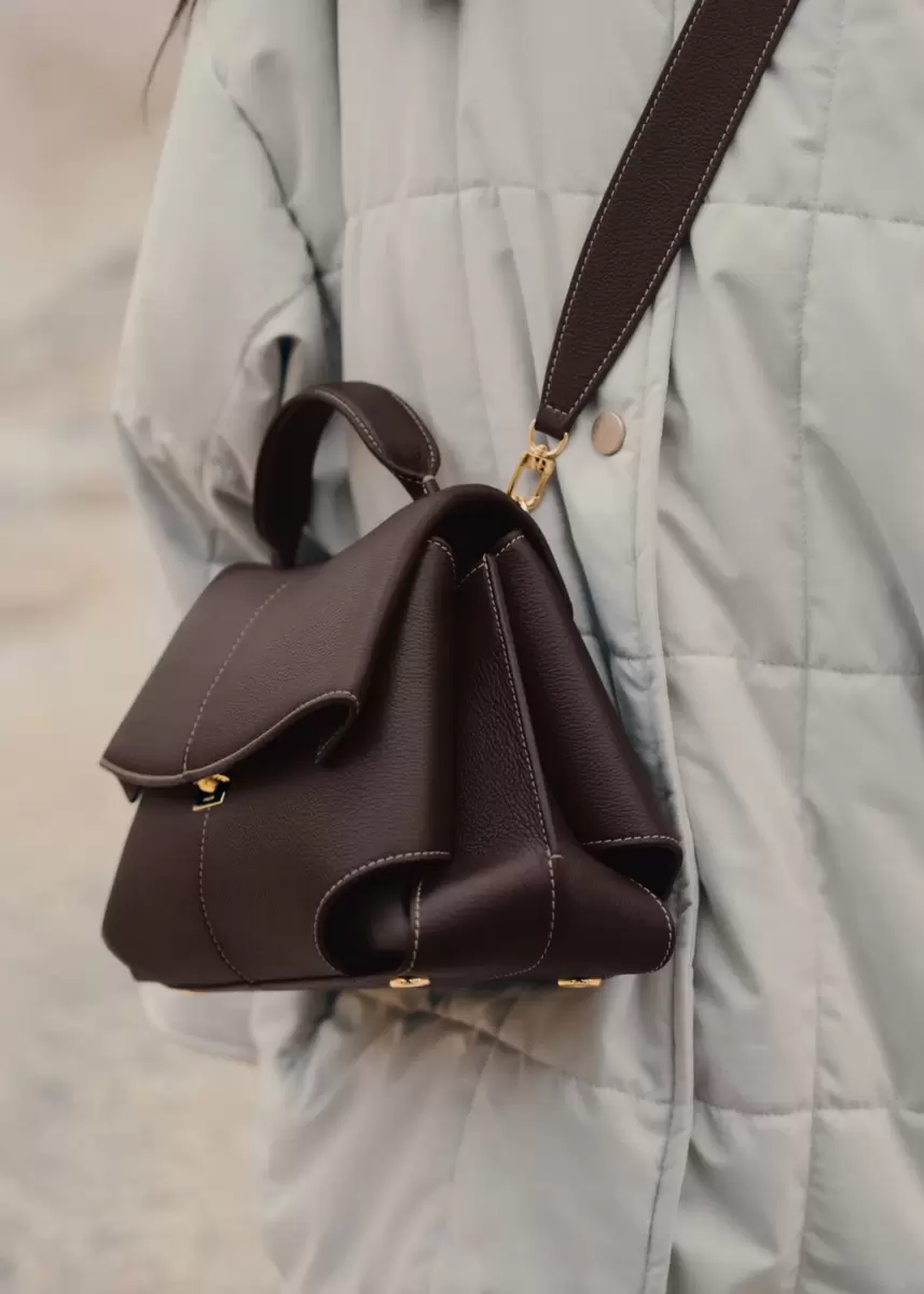 The “Mokki” model showcases the art of folding with its textured leather. The corners are cut to reveal smooth leather for a subtle interplay of textures. The bag’s interior is roomy and divided into compartments, all protected by a flap that features an engraved clasp. With its adjustable shoulder strap held in place by snap hooks, the model smoothly adapts to your movements.
