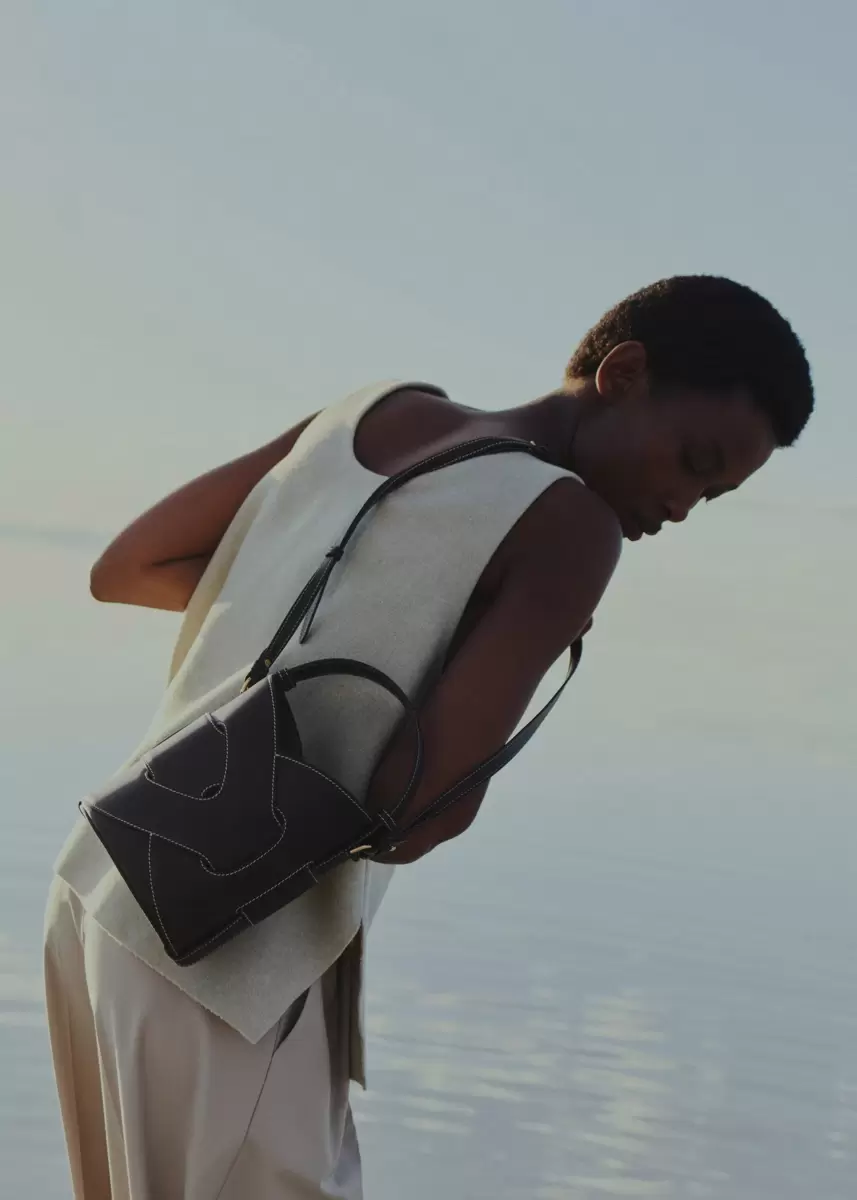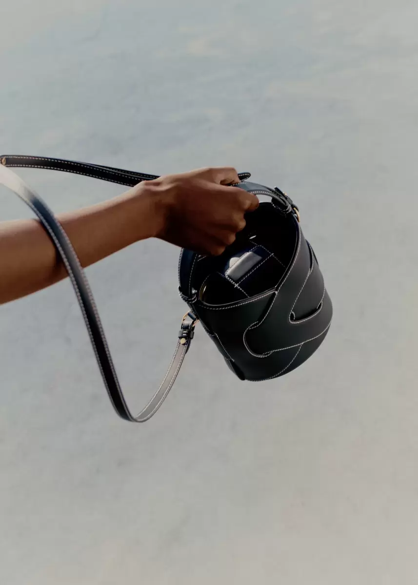 Formed by two interwoven leather pieces, the “Nodde” bucket bag creates the illusion of continuous interlacing. Its name is inspired by the French word “noeud”, meaning “knot.”