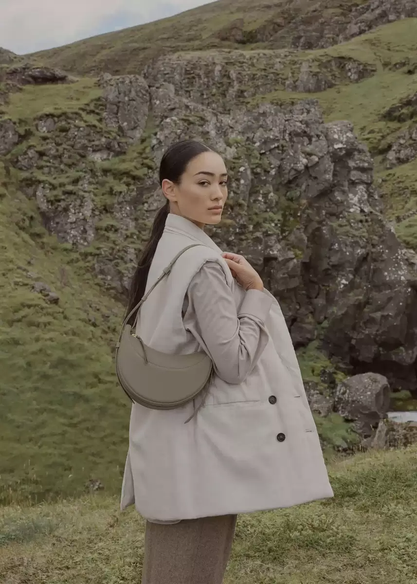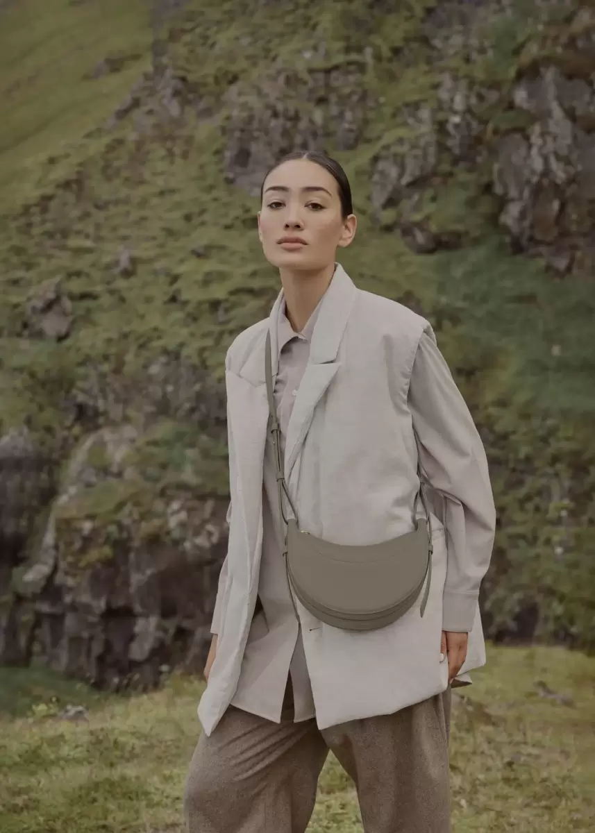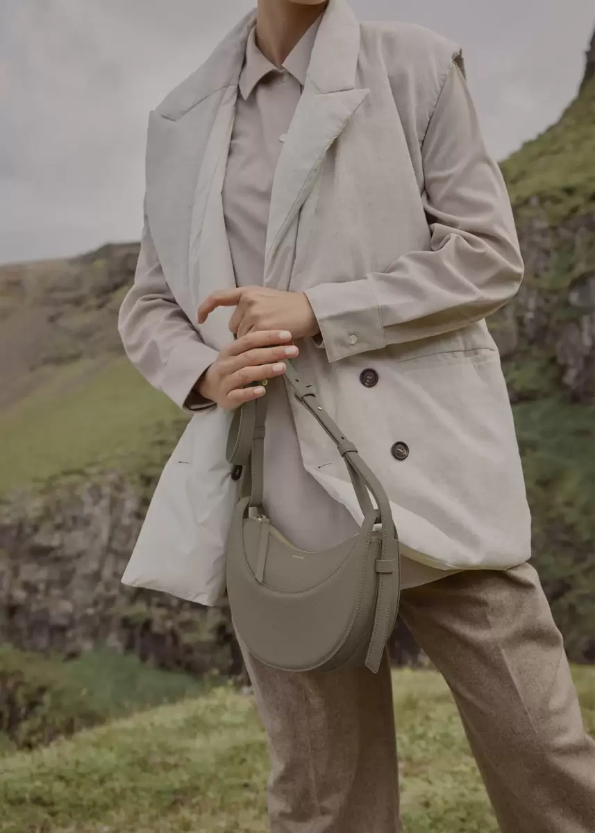 With its rounded shape, foam padding, and hand-stitching, the “Numéro Dix” is a nod to the equestrian codes of saddlery. Its half-moon design highlights juxtaposing curves.