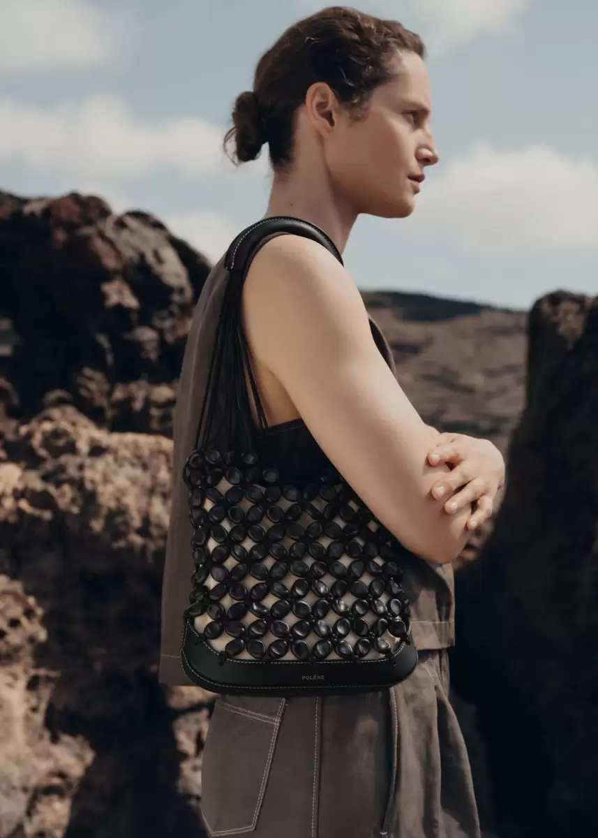 From the Plèi collection, which puts leather off-cuts front and center, the “Solé” model blends innovation and artisanship. Made in France, the 240 pebble-like pearls are created using leather off-cuts from Polène collections. They are then threaded onto waxed cotton cording and held in place by 120 handmade knots using the traditional technique of macramé.nLeather detailing embellishes this net-inspired bag with its stitched smooth leather base and handle.
