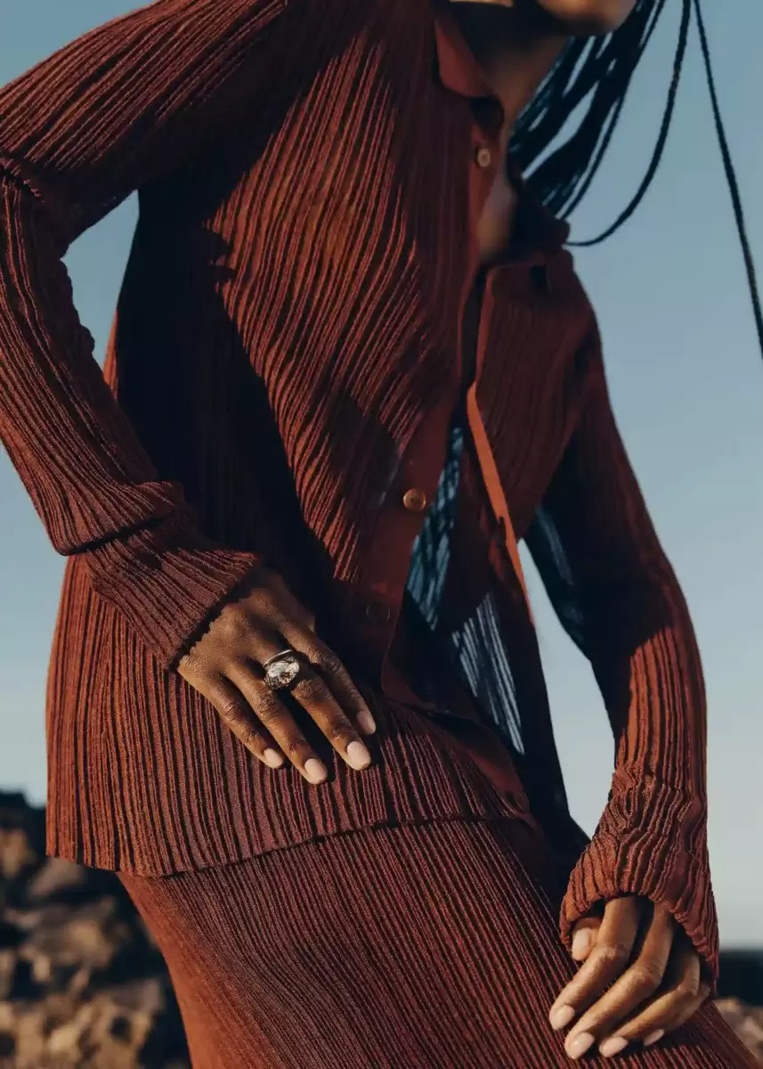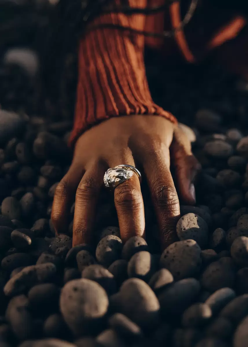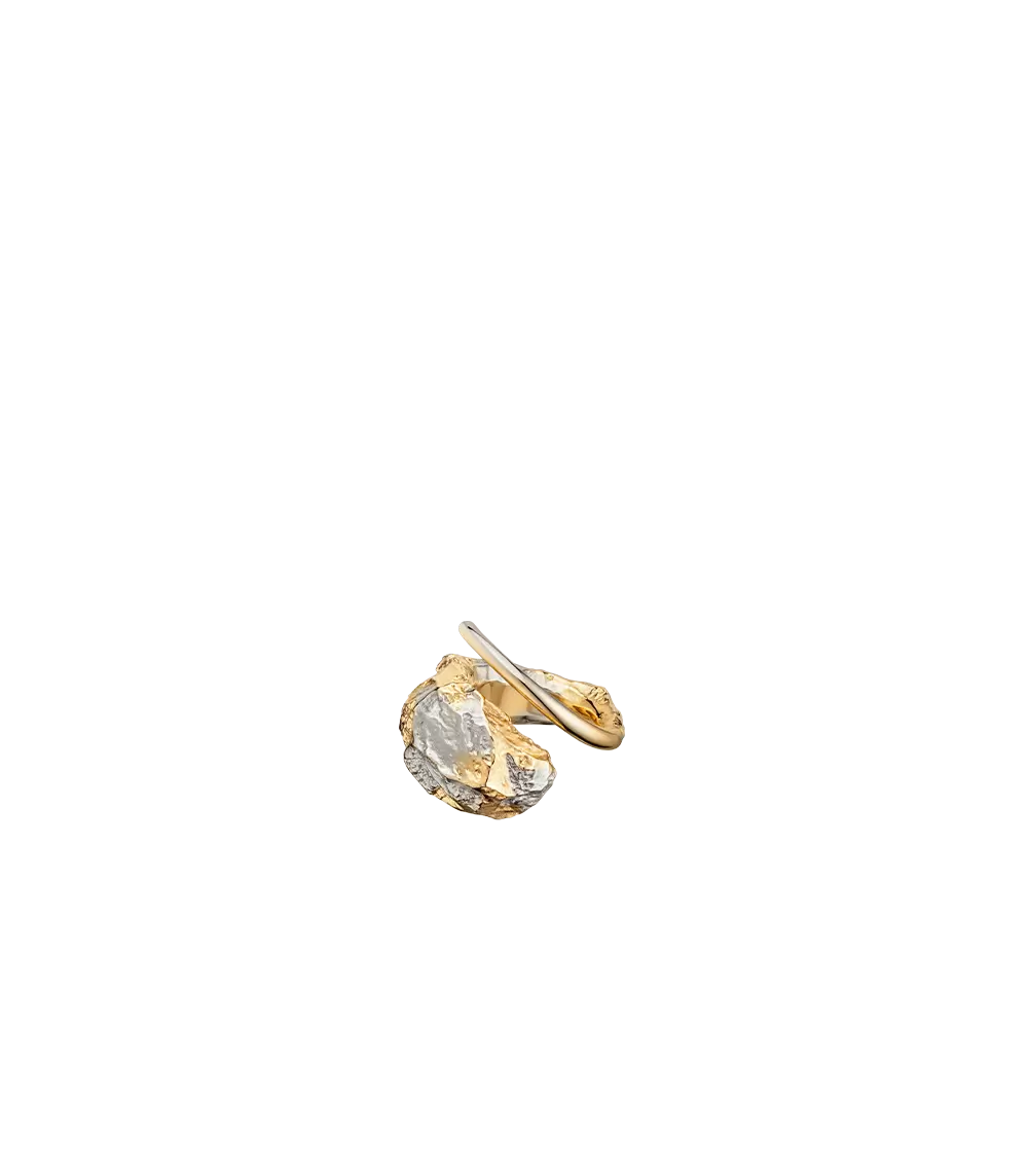 The beauty of the Eroz ring comes from the contrast between the roughness of the large rock and the refined polish of the ring itself. This edition combines the silvery hue of palladium with the delicate sparkle of 24-carat gold.