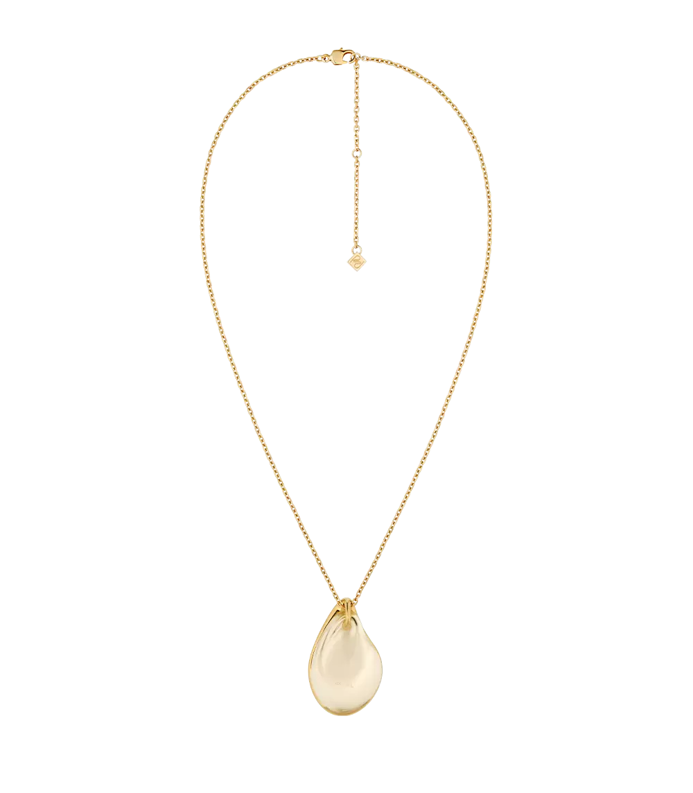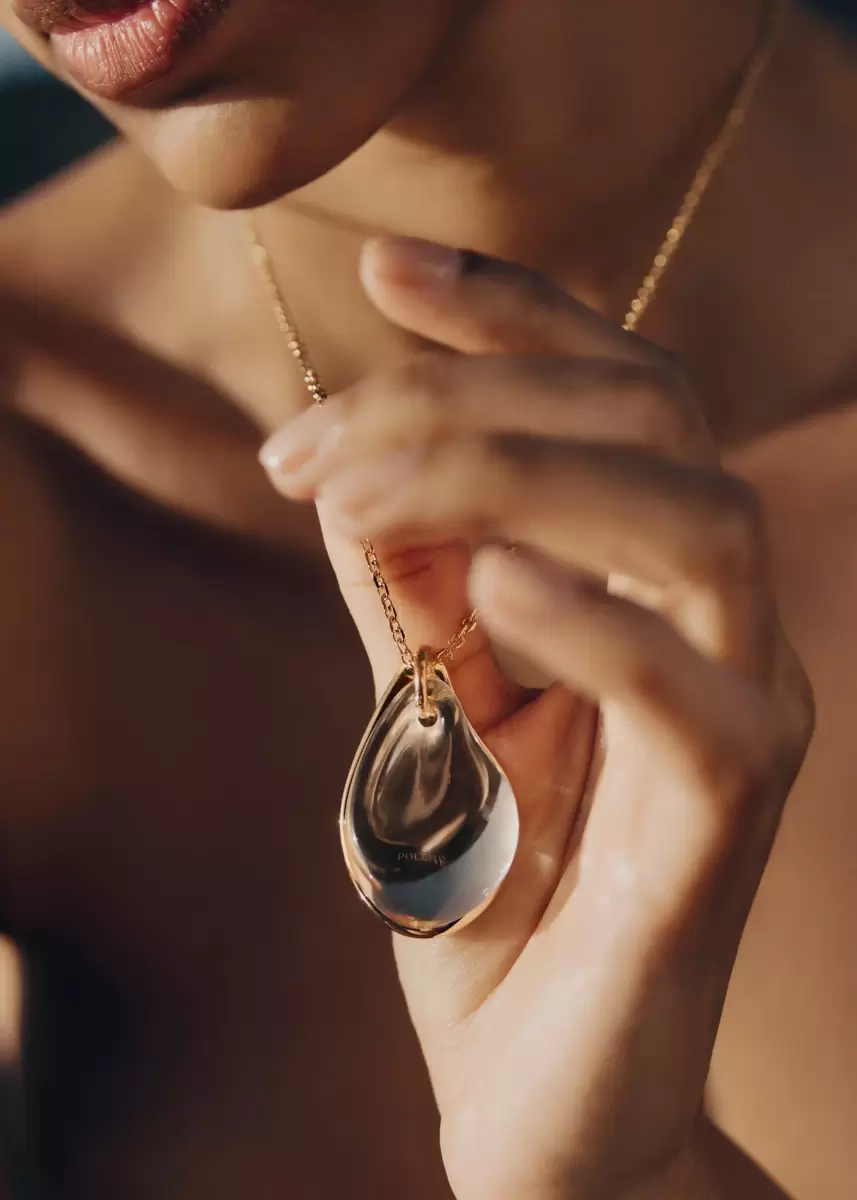 A pendant held by a fine chain overlays a sculpted glass droplet with a gold-plated brass plate that bears an engraved Polène logo.