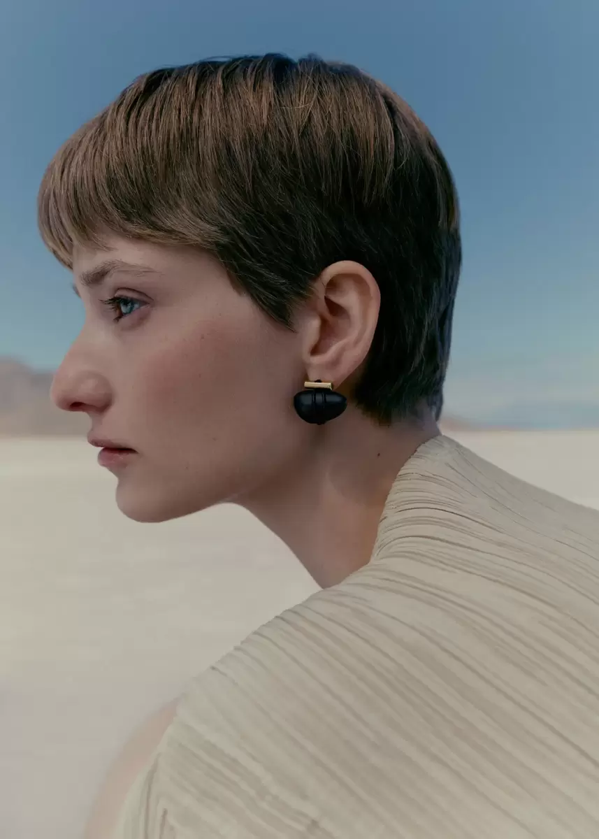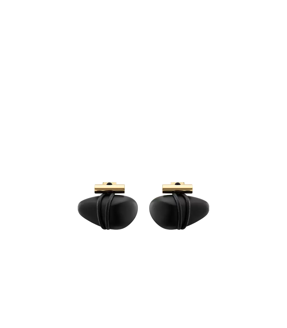 The Téré stud earrings echo the organic shape of beach pebbles. The hand-polished stones are interlaced with delicate leather cording.